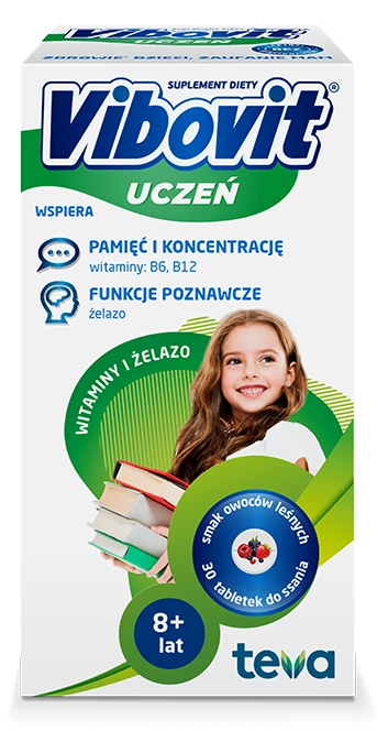 Vibovit® Uczeń to suplement diety o smaku owoców leśnych zawierający witaminy i żelazo. Tabletki do ssania przeznaczone są dla dzieci od 8 lat. Dzieci na różnych etapach wzrostu i w różnym wieku mają inne zapotrzebowanie na składniki odżywcze. Vibovit® Uczeń kompleks witamin z żelazem stworzony został z myślą o dzieciach w wieku szkolnym od 8 do 12 lat. Tabletki mają zabawne kształty, dzięki czemu nie można je pomylić z żadnymi innymi.