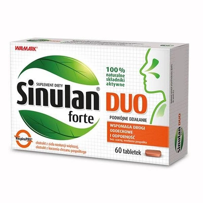 Sinulan Duo Forte to suplement diety zawierający w składzie składniki aktywne w 100% pochodzenia naturalnego. Kompozycja preparatu opiera się na 6 ekstraktach roślinnych z: