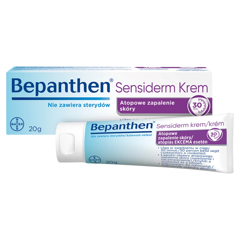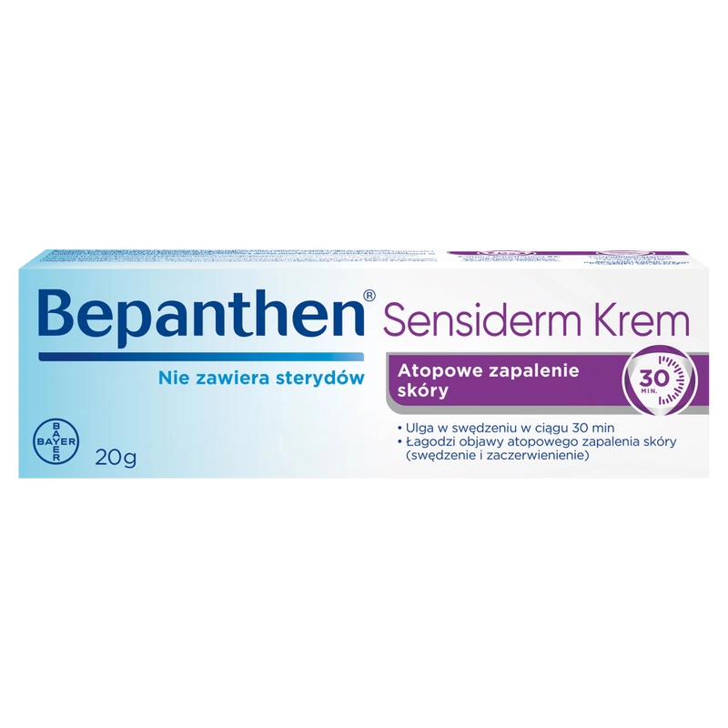 Bepanthen® Sensiderm Krem to preparat o wielokierunkowym działaniu. Znosi świąd i zaczerwienienie skóry w przebiegu atopowego zapalenia skóry, egzemy czy skórnych reakcji alergicznych.