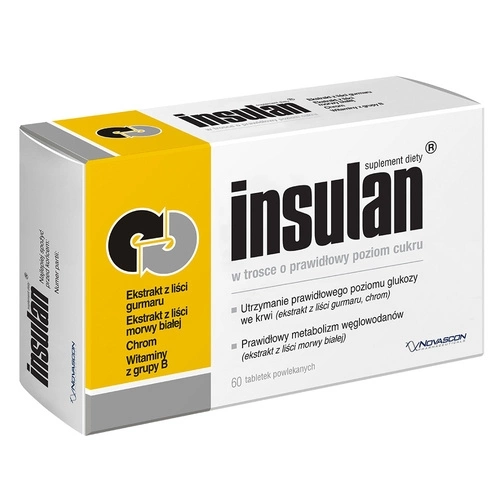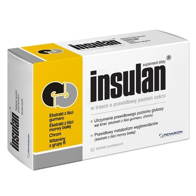 Novascon Insulan to suplement diety w postaci tabletek przeznaczony dla osób dorosłych. Formuła łączy w składzie ekstrakt z liści gurmaru i morwy białej wzbogacone dodatkowo o witaminę B6, kwas foliowy, chrom i witaminę B12 dla uzupełnienia codziennej diety.