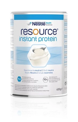 Resource Instant Protein, produkt przeznaczenia medycznego, stanowi koncentrat białka w proszku o smaku naturalnym. To niekompletna pod względem odżywczym dieta w proszku do rozpuszczenia. Żywność specjalnego przeznaczenia medycznego, do postępowania dietetycznego u pacjentów w stanach niedożywienia lub w przypadku ryzyka niedożywienia, u których może występować zwiększone zapotrzebowanie na białko, np.: z oparzeniami, z odleżynami, w chorobie nowotworowej, z ranami. Produkt należy stosować pod kontrolą lekarza.