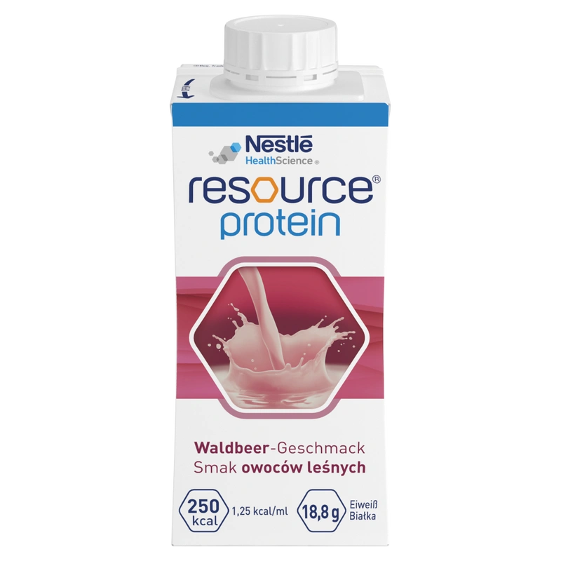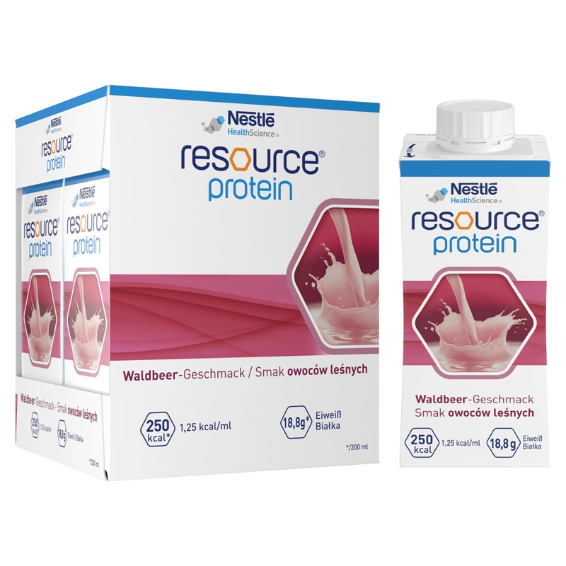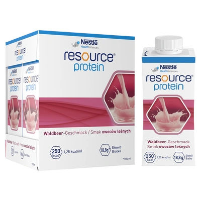 Resource Protein to kompletna pod względem odżywczym, wysokobiałkowa dieta w płynie. Żywność specjalnego przeznaczenia medycznego, do postępowania dietetycznego w stanach niedożywienia i/lub w przypadku ryzyka niedożywienia, któremu może towarzyszyć zwiększone zapotrzebowanie na białko, związanego z chorobą, np.: