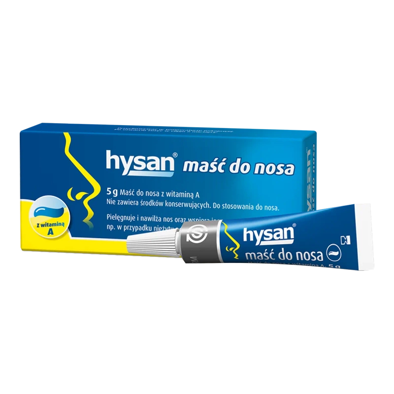 Hysan maść do nosa z witaminą A (retinolem) tworzy sprzyjającą procesowi regeneracji warstwę ochronną, koi, nawilża oraz pielęgnuje przedni odcinek nosa. Jednocześnie ułatwia usuwanie strupów i skorup. Maść ma przyjemnie miękką i gładką konsystencję, dzięki czemu rozprowadza się równomiernie na skórze i śluzówkach nosa. Zawiera palmitynian retinolu – najbardziej bezpieczną w stosowaniu formę witaminy A. Ponadto nie zawiera środków konserwujących, dlatego doskonale nadaje się do intensywnej i długotrwałej pielęgnacji nosa. Maść można stosować przez dłuższy okres czasu.