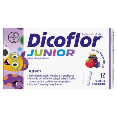 Dicoflor Junior o smaku owoców leśnych to suplement diety w saszetkach do bezpośredniego spożycia. Zawiera liofilizowane, żywe kultury bakterii Lactobacillus Rhamnosus GG. Może być stosowany przez osoby unikające glutenu w diecie.