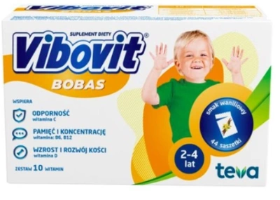 To ekspert wśród witamin dla dzieci, to kompleksowa gama suplementów diety dopasowana do potrzeb dzieci na różnych etapach życia i rozwoju. Zawiera podstawowe witaminy w porcji uzupełniajacej codzienną dietę i potrzeby dzieci w wieku od 2 do 4 lat. Saszetki Vibobas Bobas zawierają: witaminę C, która przyczynia sie do prawidłowego funkcjonowania układu odpornościowego. Witamina A przyczynia sie do do prawidłowego funkcjonowania układu odpornościowego. Witamina B6 przyczynia sie do prawidłowego funkcjonownia układu nerwowego. Witamina D wpływa na utrzymanie prawidłowej budowy kości i zębów.