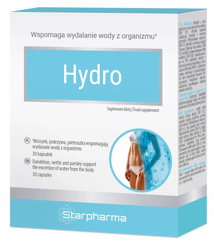 - HYDRO wydalanie wody z organizmu - suplement diety Hydro zawiera naturalne wyciągi pochodzenia roślinnego pomagające wyeliminować nadmiar wody z organizmu.