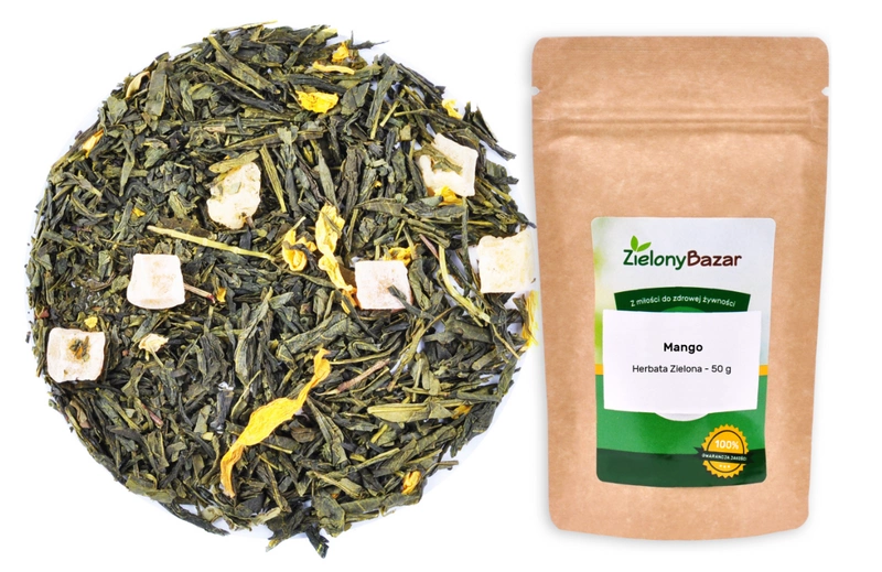 - Herbata zielona z dodatkiem owoców mango i płatków słonecznika.