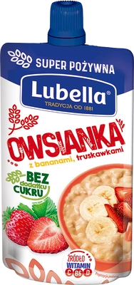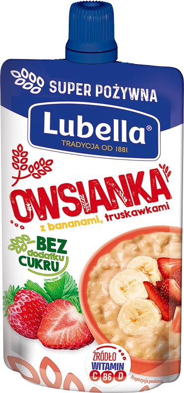 Składniki: gotowane płatki OWSIANE błyskawiczne i pełnoziarniste 40 % (woda, płatki OWSIANE błyskawiczne i pełnoziarniste), JOGURT naturalny 20 %, przecier truskawkowy 12,5 %, przecier bananowy 11 %, zagęszczony sok jabłkowy, przecier jabłkowy, zagęszczony sok bananowy 3 %, zagęszczony sok truskawkowy 0,5 %, aromat, witaminy: C, D3, B6