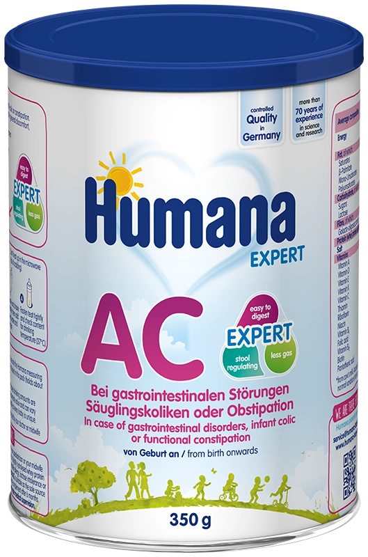 Humana AC jest przeznaczona do postępowania dietetycznego w zaburzeniach żołądkowo-jelitowych, w tym kolce niemowlęcej lub zaparciach.