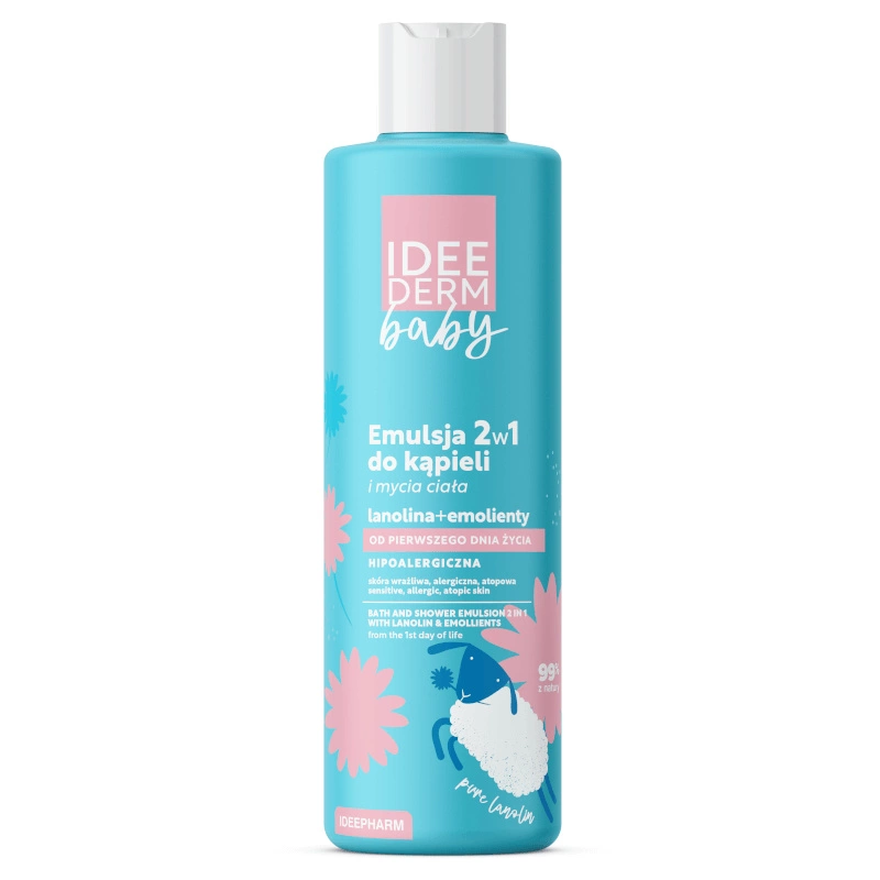 IDEE DERM BABY Emulsja 2w1 to emulsja do kąpieli opracowana z myślą o codziennej kąpieli i pielęgnacji skóry dzieci i niemowląt od 1. dnia życia. Głównym składnikiem aktywnym emulsji jest hipoalergiczna lanolina, której skład przypomina ludzkie sebum i jest doskonale tolerowana przez delikatną skórę dziecka. Emulsja zapobiega przesuszeniom oraz delikatnie natłuszcza pozostawiając skórę dziecka idealnie gładką, miękką i ukojoną.