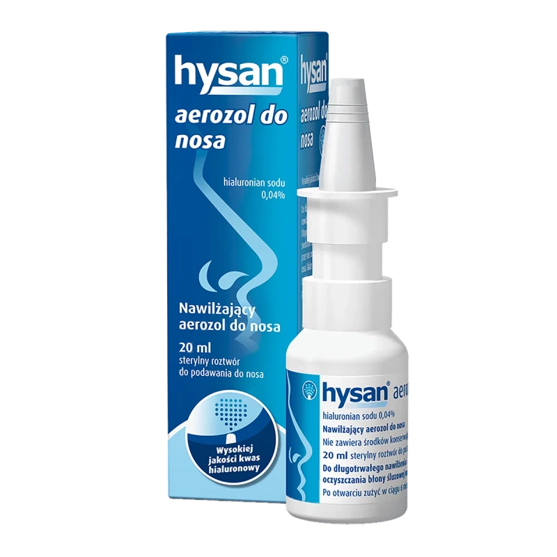 Hysan to sterylny roztwór bez konserwantów, w postaci aerozolu, do miejscowego podawania do nosa. Odpowiedni do długotrwałego nawilżenia śluzówki nosa oraz do udrażniania nosa. Ułatwia swobodne oddychanie przez nos i wspiera samooczyszczanie. Nawilża i pielęgnuje. Zawiera hialuronian sodu, który jest naturalną substancją występującą między innymi ludzkim ciele, oraz chlorek sodu, bufor fosforanowy i wodę. Składniki te zostały dobrane w taki sposób, by szczególnie dobrze odpowiadać naturalnym właściwościom błony śluzowej nosa. Preparat tworzy na powierzchni śluzówki przyjemną warstwę ochronną, która utrzymuje się przez długi czas. W porównaniu do standardowych aerozoli z wodą morską, zaletą aerozolu do nosa Hysan jest to, że nie trzeba go stosować tak często, aby zapewnić równomierne nawilżenie wrażliwej śluzówki nosa. Dzięki zastosowaniu wyjątkowej techniki wentylacji nie zawiera środków konserwujących, które często wywołują reakcje alergiczne i mogą podrażniać wrażliwą śluzówkę nosa. Nie zawiera także gazu. Mechanizm systemu dozowania działa czysto mechanicznie.