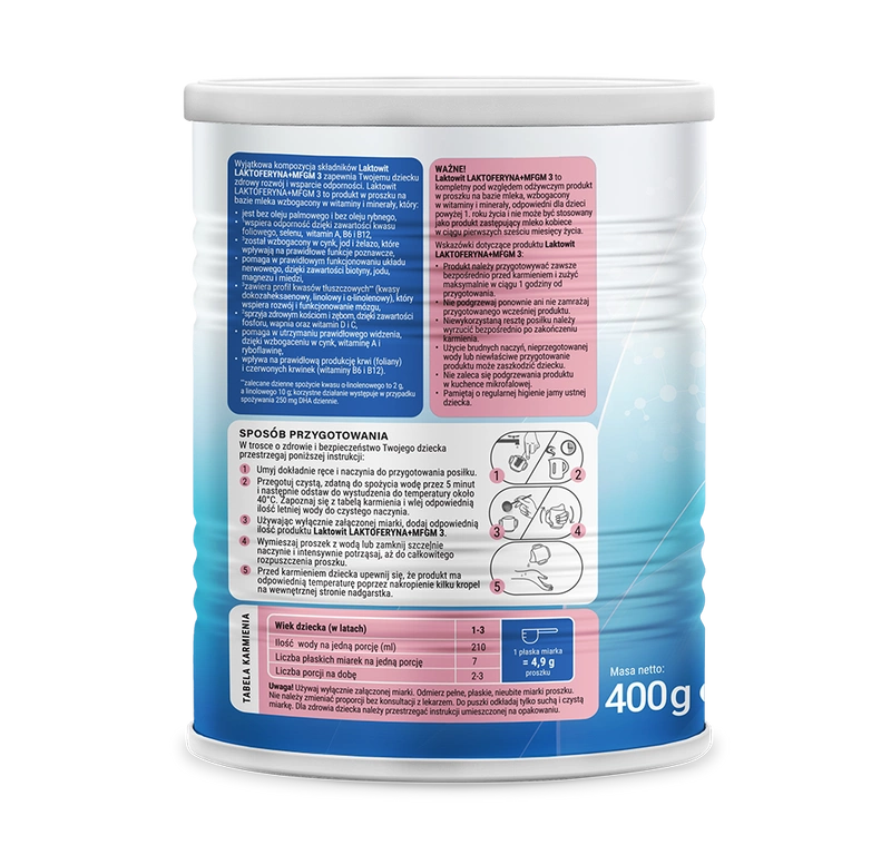 - Laktowit LAKTOFERYNA+MFGM zawiera kluczowe i cenne składniki, które występują naturalnie w mleku matki, lecz nie ma ich w innych mlekach modyfikowanych dostępnych na polskim rynku.