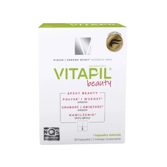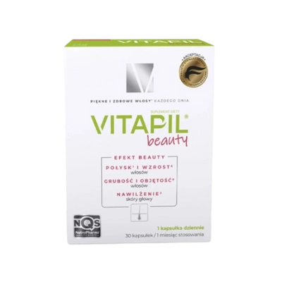 Vitapil® Beauty to suplement diety w postaci kapsułek opracowany z myślą o osobach dorosłych, które pragną zadbać o zdrowie włosów i dobrą kondycję skóry głowy. Każda kapsułka to kompozycja 15 starannie dobranych składników. Zawiera witaminy i składniki mineralne, które uzupełniono dodatkowo o aminokwasy, sproszkowane pędy bambusa zawierające 75% krzemionki i hialuronian sodu.