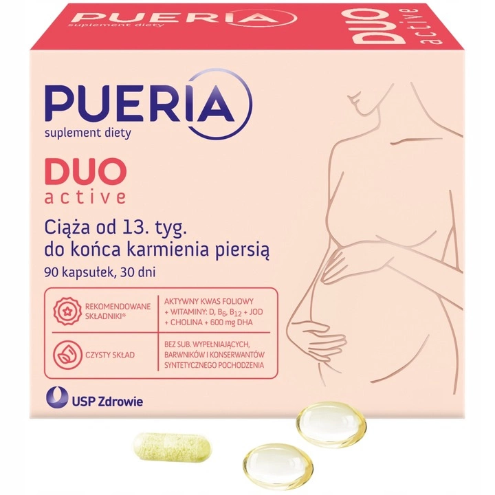 - Pueria Duo Active to suplement diety opracowany specjalnie dla kobiet w ciąży od 13. tyg. do końca karmienia piersią.