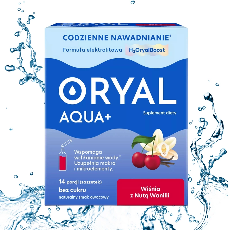 - Oryal Aqua+ Wiśnia z Nutą Wanilii to innowacyjny suplement diety zawierający elektrolity, prebiotyk i mikroelementy, które wspierają właściwe nawodnienie.