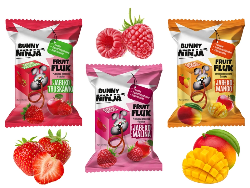 Fruit Fluk o smaku jabłka i truskawki to długi zakręcony sznurek naładowany owocami, który powstaje bez dodatku cukru. Innowacyjna forma przekąski Bunny Ninja z pewnością zawróci w głowie każdemu małemu poszukiwaczowi owocowych przygód. Fruit Fluk to nie tylko eksplozja smaków, ale i moc kreatywnej zabawy. Cienki i długi sznureczek można wyciągać, przeciągać, urywać i do woli się nim bawić, zapewniając sobie i najbliższym same pozytywne wrażenia. W opakowaniu znajduje się przeurocze pudełeczko, opatrzone wesołą minką Bunnego, która momentalnie wywoła u każdego szeroki uśmiech na twarzy, a wypełniony słodkością kartonik gwarantuje niekończącą się owocową zabawę.