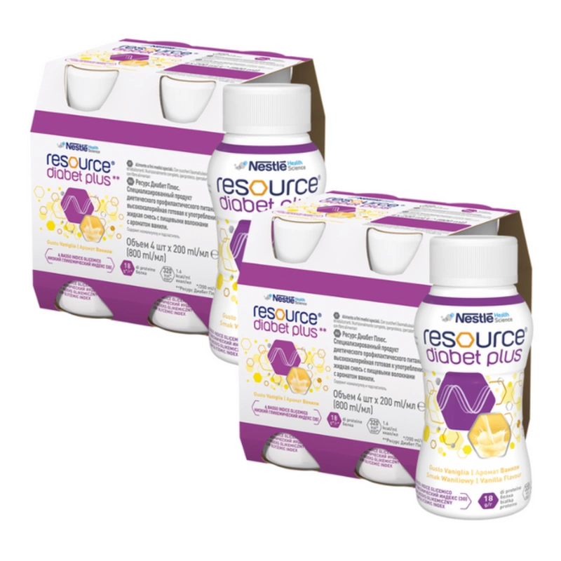 Resource Diabet Plus to kompletna pod względem odżywczym, wysokobiałkowa i wysokoenergetyczna dieta w płynie, z dodatkiem błonnika. Żywność specjalnego przeznaczenia medycznego, do postępowania dietetycznego w przypadku niedożywienia lub ryzyka niedożywienia u pacjentów z zaburzeniami metabolizmu glukozy, np.: