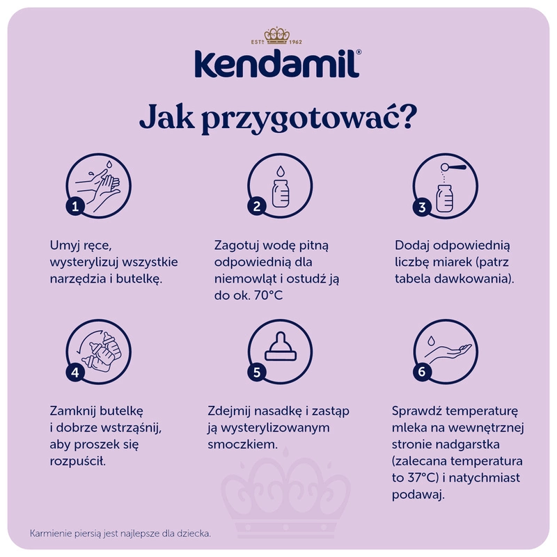 Ważna uwaga: Karmienie piersią jest najlepszym sposobem żywienia niemowląt. Preparat dla niemowląt KENDAMIL PREMIUM 1 jest odpowiedni do karmienia niemowląt już od urodzenia, jeśli nie mogą być one karmione piersią i powinien być stosowany wyłącznie za radą niezależnych osób wykwalifikowanych w dziedzinie medycyny, żywienia, farmacji lub innych specjalistów odpowiedzialnych za opiekę nad matką i dzieckiem. Dbaj o higienę jamy ustnej dziecka w okresie wzrostu jego pierwszych ząbków, zwłaszcza przed snem. Postępuj zgodnie z instrukcjami dotyczącymi przygotowania, karmienia i przechowywania, w przeciwnym razie zagrozisz zdrowiu niemowlęcia.