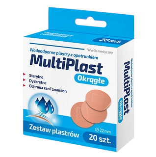 - MultiPlast Okragłe Wodoodporne plastry z opatrunkiem stanowią doskonałą ochronę przed wodą i zanieczyszczeniami dla drobnych otarć i skaleczeń.
