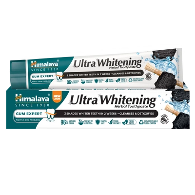 Ziołowa pasta do zębów Himalaya Gum Expert Ultra Whitening to połączenie naturalnych składników, m.in. węgla aktywnego pozyskanego z łupiny kokosa oraz oleju z czarnuszki, które dogłębnie oczyszczają i detoksykująca zęby, czyniąc je bielszymi o 3 odcienie w ciągu 2 tygodni. Pasta Ultra Whitening zapewnia naturalne wybielanie - nie zawiera chemicznych wybielaczy oraz fluoru. Jest w 100% wegańska.