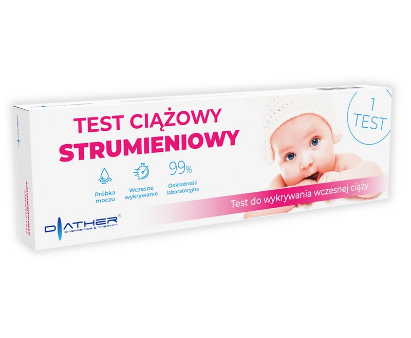Test ciążowy strumieniowy jest przeznaczony do wykrycia obecności hormonu hCG w moczu kobiety w celu potwierdzenia lub wykluczenia zapłodnienia komórki jajowej. Test można wykonywać o każdej porze dnia, jednakże najwyższe stężenie hormonu odnotowuje się moczu porannym oddanym po przebudzeniu. Badanie jest proste oraz szybkie w wykonaniu. Oczekiwanie na wynik trwa jedynie 3 minuty.