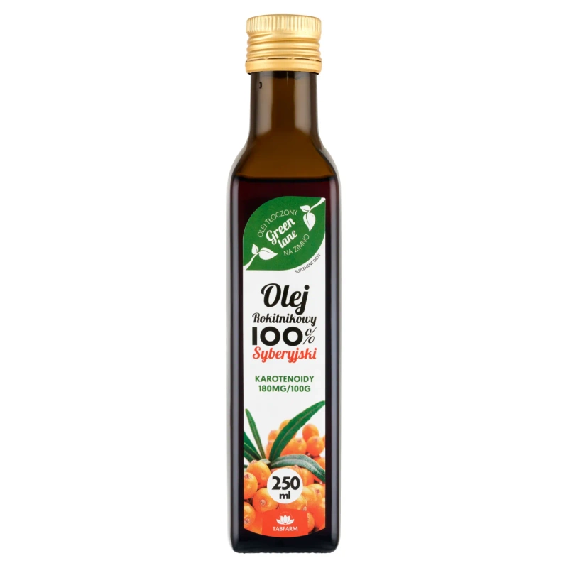 Zimnotłoczony olej z rokitnika Tabfarm urozmaici codzienną dietę swoimi charakterystycznymi właściwościami, w tym kolorem, smakiem i aromatem. Butelka z ciemnego szkła zawiera 250 ml oleju rokitnikowego.