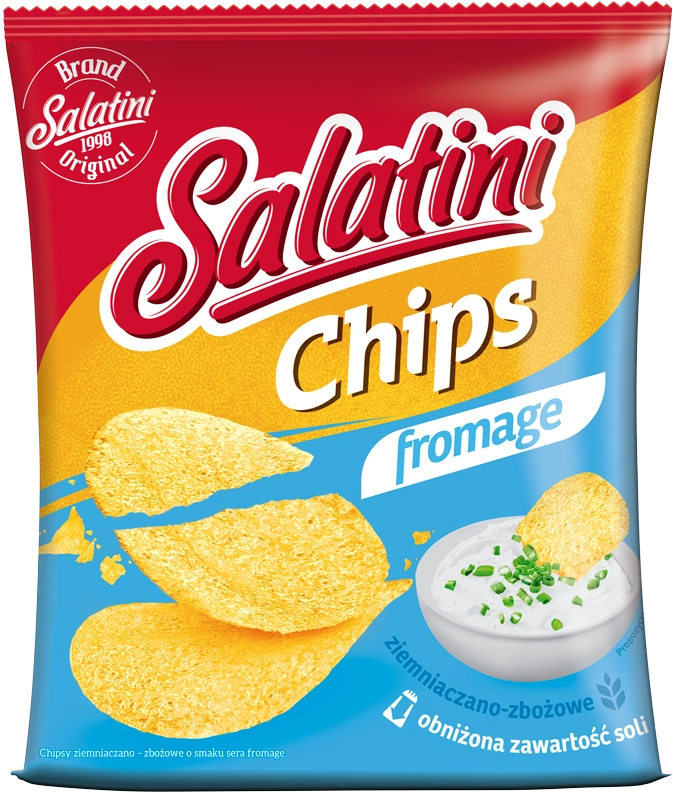 Chipsy ziemniaczano-zbożowe o smaku sera fromage to znakomita przekąska dla dzieci i młodzieży. Snacki Salatini charakteryzują się obniżoną zawartością tłuszczu i soli, wyprodukowane zostały na bazie ziemniaków i zbóż. Wypiekane, a nie smażone – ekstra chrupiące!