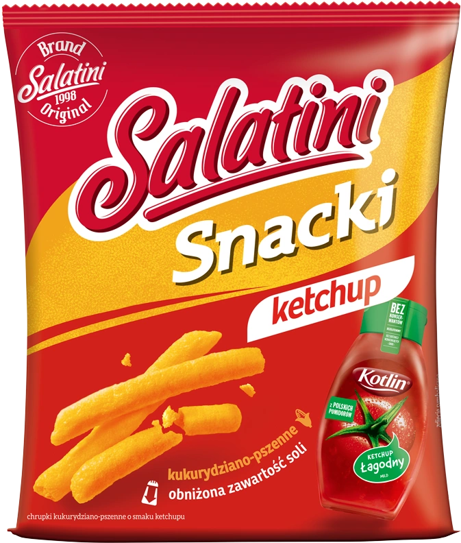 Chipsy ziemniaczano-zbożowe o smaku ketchupu to znakomita przekąska dla dzieci i młodzieży. Snacki Salatini charakteryzują się obniżoną zawartością tłuszczu i soli, wyprodukowane zostały na bazie ziemniaków i zbóż. Wypiekane, a nie smażone – ekstra chrupiące!
