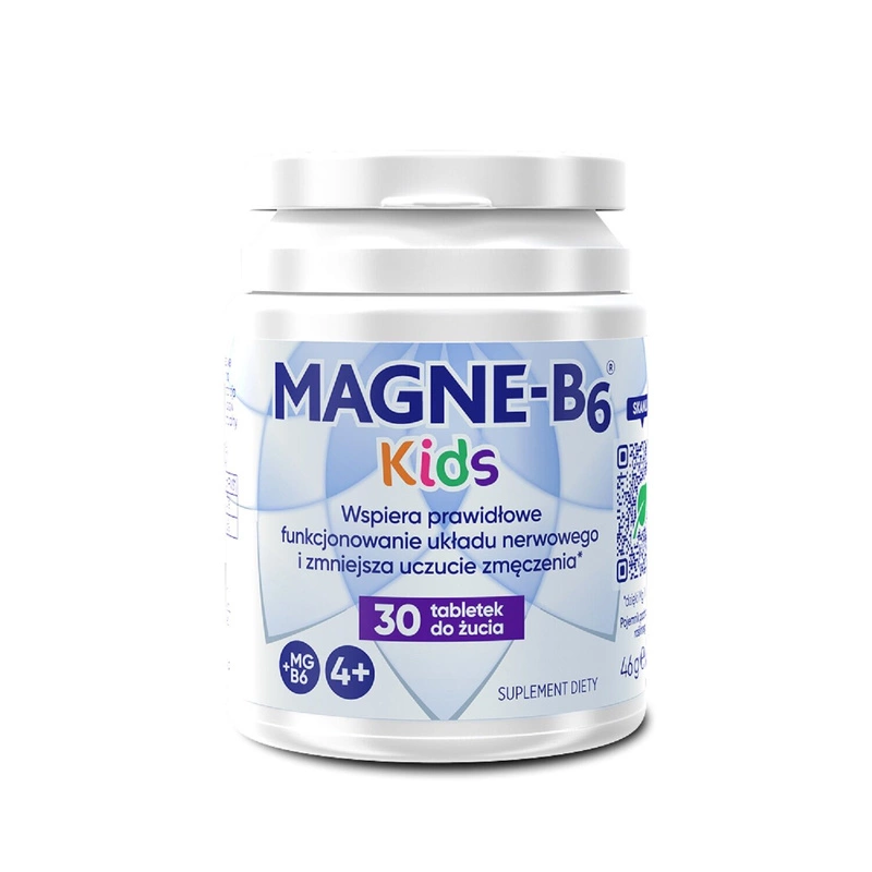 Magne B6 Kids to suplement diety w formie tabletek do żucia, przeznaczony dla dzieci. Produkt zawiera magnez oraz witaminę B6 (substancja czynna: Cytrynian magnezu; Witamina B6) Tabletki mają przyjemny smak, co ułatwia ich przyjmowanie przez dzieci. Opakowanie zawiera 30 tabletek.
