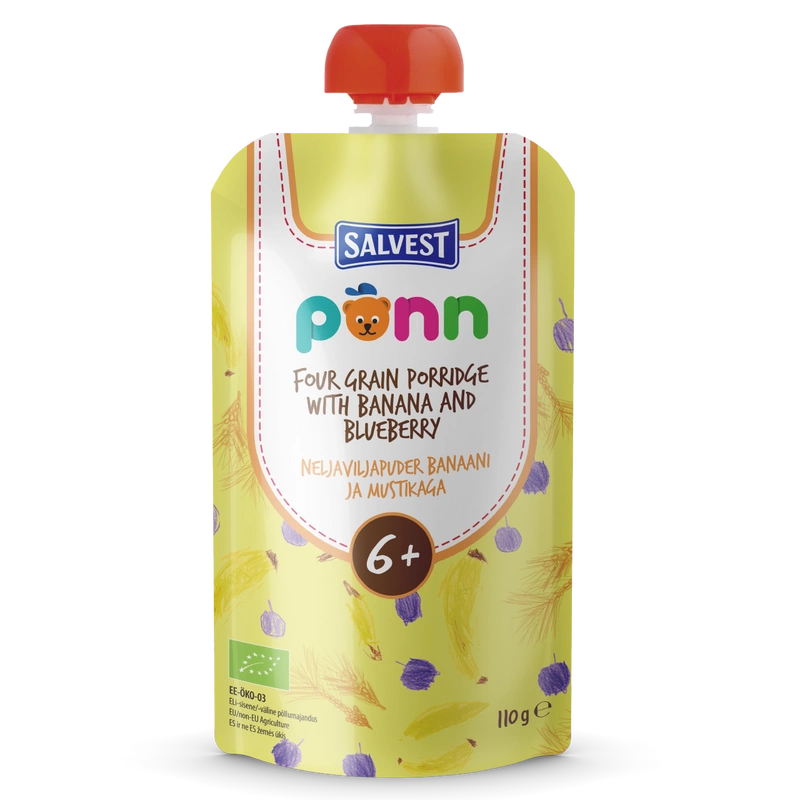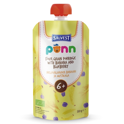Mus Salvest Põnn Banan z jagodami i płatkami zbóż to wyjątkowy produkt wyprodukowany jedynie ze starannie dobranych składników organicznych. Owoce i zboża pochodzą wyłącznie z rolnictwa ekologicznego od sprawdzonych dostawców. Wybierając mus Salvest Põnn, kupujesz produkt, który jest w 100% BIO — bez konserwantów i dodatku cukru. Dzięki temu masz pewność, że Twoje dziecko dostaje to, co najlepsze — czysty smak natury. Produkt w formie lekkiego, soczystego musu idealnie sprawdzi się jako posiłek lub przekąska w środku dnia.
