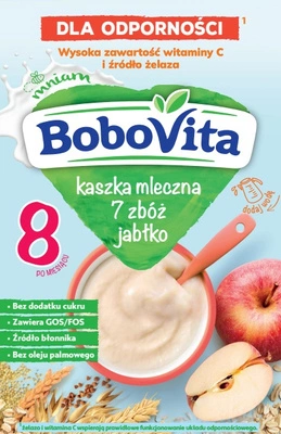 Kaszka mleczna BoboVita 7 zbóż i jabłko przeznaczona dla niemowląt po 8. miesiącu życia. Zawiera dużą ilość witaminy C i żelaza, które wspierają prawidłowe funkcjonowanie układu odpornościowego.