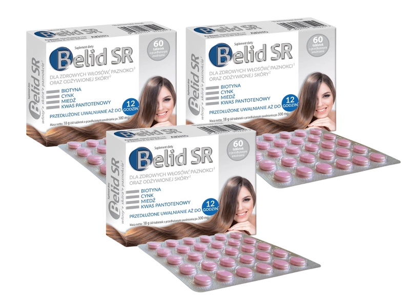Belid SR Suplement diety z biotyną na zdrowe włosy, skórę i paznokcie ZESTAW 3 x 60 tabletek