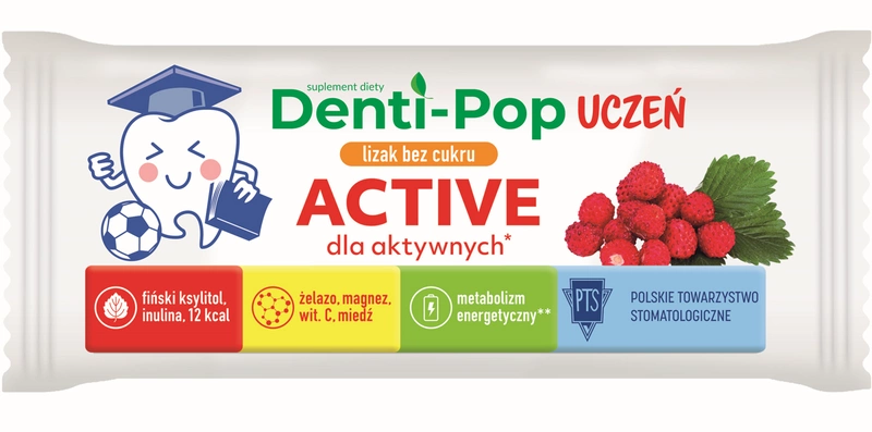 - Suplement diety Denti-Pop Uczeń lizak bez cukru ACTIVE o smaku poziomkowym zawiera substancję słodzącą: fiński ksylitol. Nie zawiera cukrów. *Dla osób aktywnych w okresie wzmożonego wysiłku fizycznego.