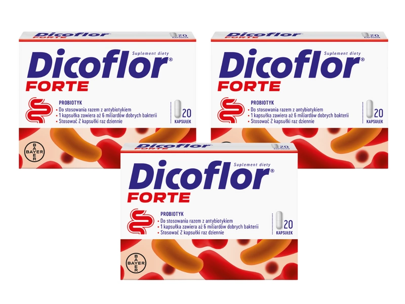 Dicoflor® Forte to suplement diety w postaci kapsułek, opracowany z myślą o uzupełnieniu diety osób dorosłych i dzieci powyżej 3 roku życia w składniki zawarte w produkcie. W składzie znajdują się żywe kultury bakterii Lactobacillus rhamnosus GG (ATCC 53103). Każda kapsułka Dicoflor® Forte pozwala na dostarczenie do organizmu 6 miliardów komórek bakteryjnych. Wartość ta jest gwarantowana do końca okresu ważności suplementu diety tylko w przypadku przestrzegania warunków przechowywania. Żywe kultury bakterii Lactobacillus rhamnosus GG posiadają udowodnione w badaniach klinicznych bezpieczeństwo stosowania.