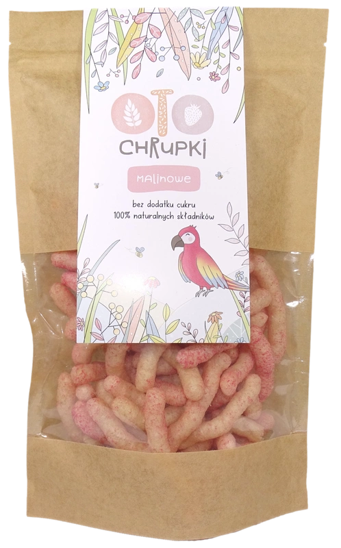 Chrupki Malinowe (Orkiszowe pełnoziarniste z upraw ekologicznych) — Tym razem niewielkie, chrupiące pałeczki przyleciały na skrzydłach papużki prosto ze słonecznej doliny. Zanim ruszyła w dalszą podróż, szepnęła nam słówko o swojej magicznej recepturze!
