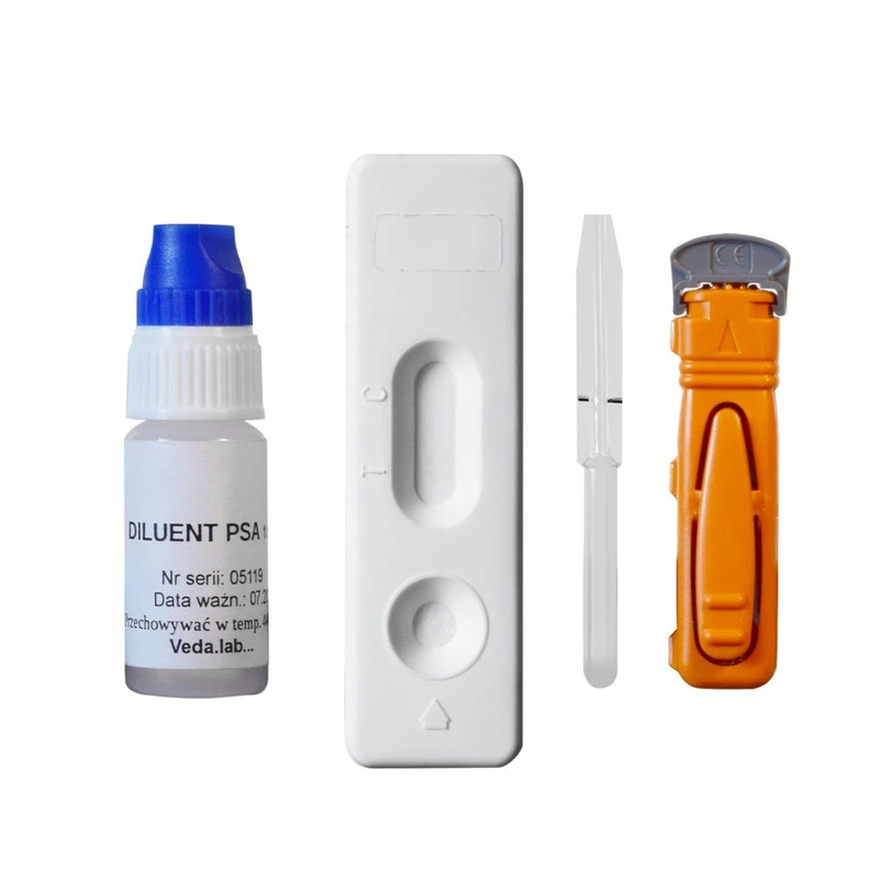 Test PSA przeprowadza się na próbce krwi pobranej z palca. W opakowaniu znajdziemy wszystkie potrzebne do badania narzędzia, takie jak lancet do nakłucia palca, plastikową pipetkę do pobrania próbki krwi, pojemnik z zakraplaczem zawierającym niezbędny do analizy odczynnik oraz płytkę testową.