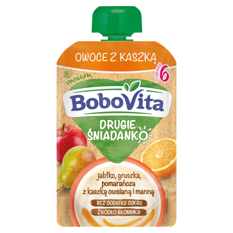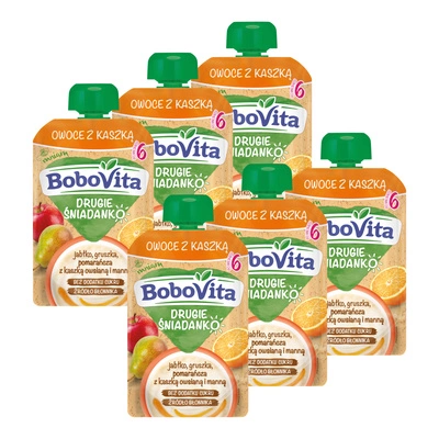 BoboVita Drugie Śniadanko Owoce z kaszką jabłko gruszka pomarańcza po 6 miesiącu ZESTAW 6 x 100 g