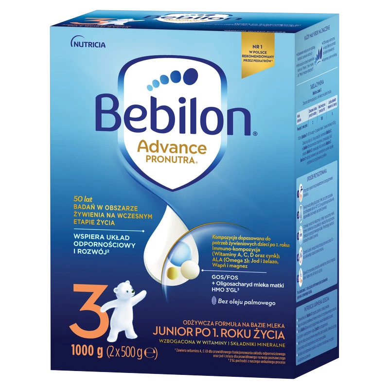 Dla zdrowia dziecka ważna jest urozmaicona i zbilansowana dieta oraz zdrowy tryb życia. Należy zwrócić uwagę na prawidłową higienę pierwszych ząbków, szczególnie przed snem. Bebilon 3 jest przeznaczony wyłącznie dla dzieci powyżej 1. roku życia. Produkt powinien stanowić tylko część zróżnicowanej diety dziecka.