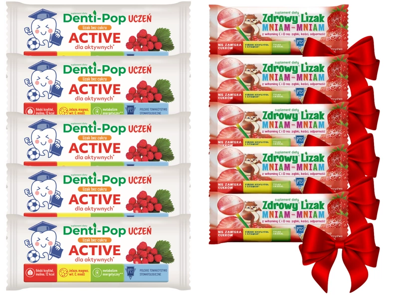 - Suplement diety Denti-Pop Uczeń lizak bez cukru ACTIVE o smaku poziomkowym zawiera substancję słodzącą: fiński ksylitol. Nie zawiera cukrów. *Dla osób aktywnych w okresie wzmożonego wysiłku fizycznego.
