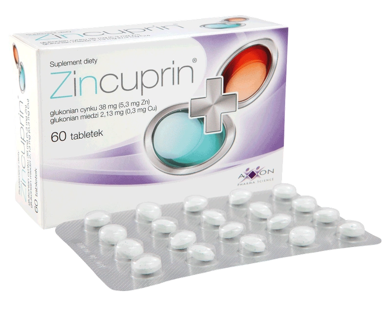 Do produkcji suplementu diety Zincuprin® wykorzystano glukonian miedzi. Każda tabletka to 2,13 mg glukonianu miedzi, w tym 0,3 mg jonów miedzi (Cu) – 30% pokrycia referencyjnych wartości spożycia na ten ważny mikroelement.