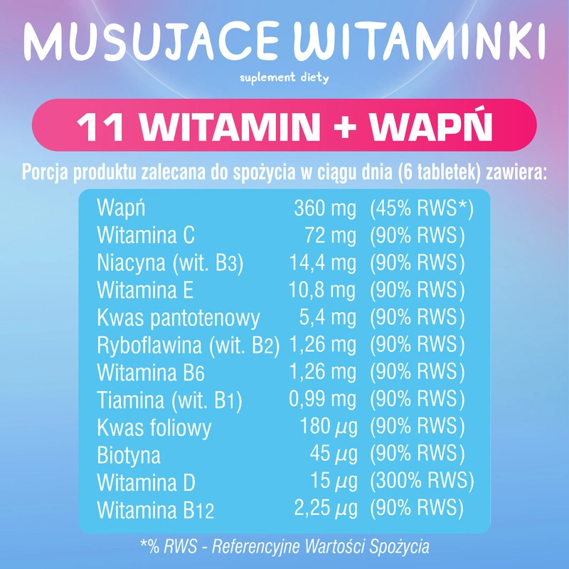 Porcja dzienna 6 tabletek zawiera: Składnik Ilość % RWS* Wapń 360 mg 45% Witamina C 72 mg 90% Niacyna 14,4 mg 90% Witamina E 20 mg 90% Kwas pantotenowy 5,4 mg 90% Witamina B2 1,26 mg 90% Witamina B6 1,26 mg 90% Witamina B1 0,99 mg 90% Kwas foliowy 180 µg 90% Biotyna 45 µg 90% Witamina D 15 µg 300% Witamina B12 2,25 µg 90% % RWS – Referencyjne Wartości Spożycia