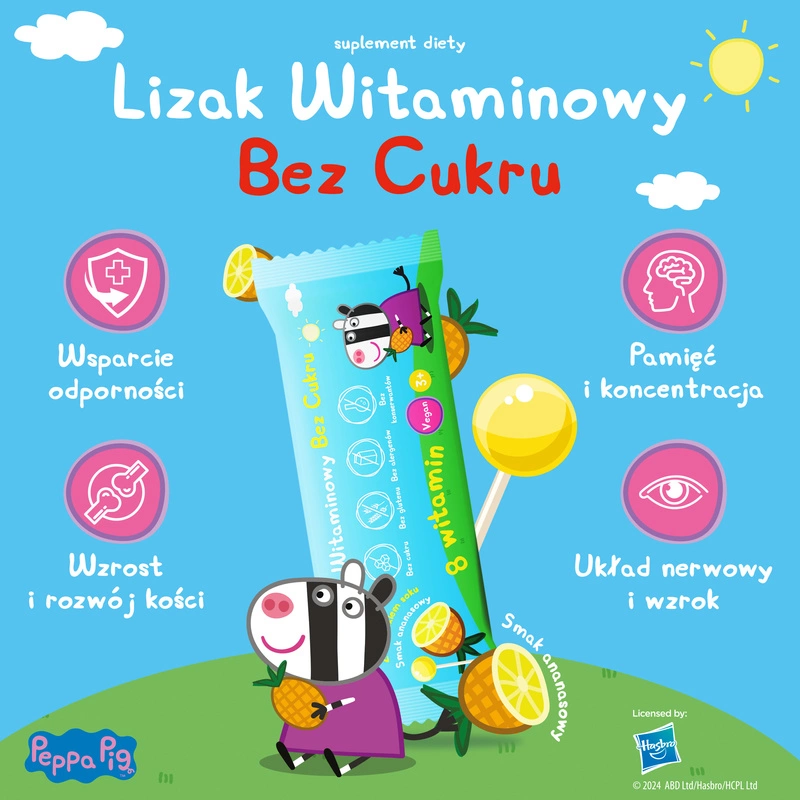 - Lizak Witaminowy Bez Cukru Peppa® Zawierają 8 kluczowych witamin (A, C, E, B6, B12, niacyna, kwas foliowy, biotyna) oraz naturalne soki owocowe.