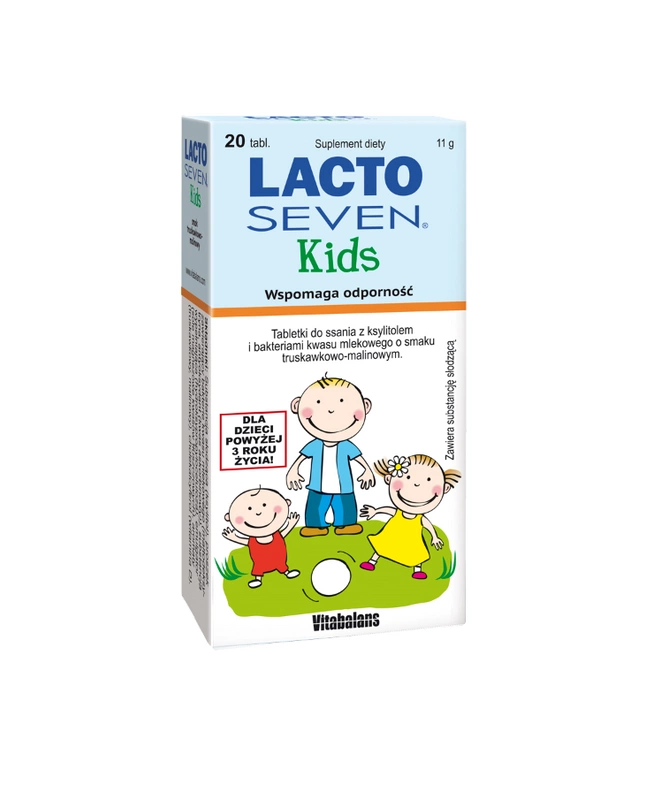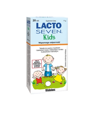 Lacto Seven Kids tabletki do ssania mogą stosować dzieci powyżej 3 roku życia. Tabletki zawierają również witaminę D3, która przyczynia się do prawidłowego funkcjonowania układu odpornościowego. Tabletkę można podawać dziecku każdego dnia po posiłku. Bakterie kwasu mlekowego są również korzystne podczas antybiotykoterapii, podczas wakacji oraz gdy małe dzieci uczą się jeść nowe pokarmy.