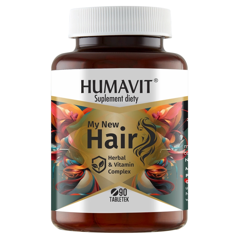 HUMAVIT® MY NEW HAIR to zaawansowana formuła stworzona, aby wesprzeć kondycję włosów, skóry i paznokci. Dzięki starannie dobranym składnikom, takich jak biotyna, cynk, skrzyp polny, pokrzywa i drożdże piwowarskie, produkt pomaga zachować mocne włosy.