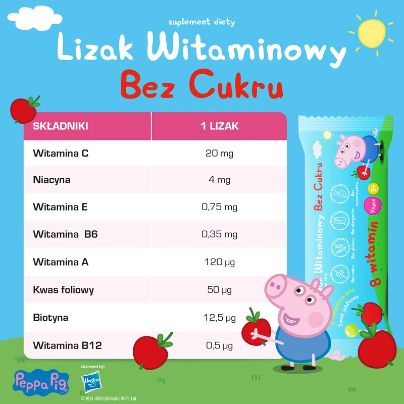 - Lizak Witaminowy Bez Cukru Peppa® Zawierają 8 kluczowych witamin (A, C, E, B6, B12, niacyna, kwas foliowy, biotyna) oraz naturalne soki owocowe.
