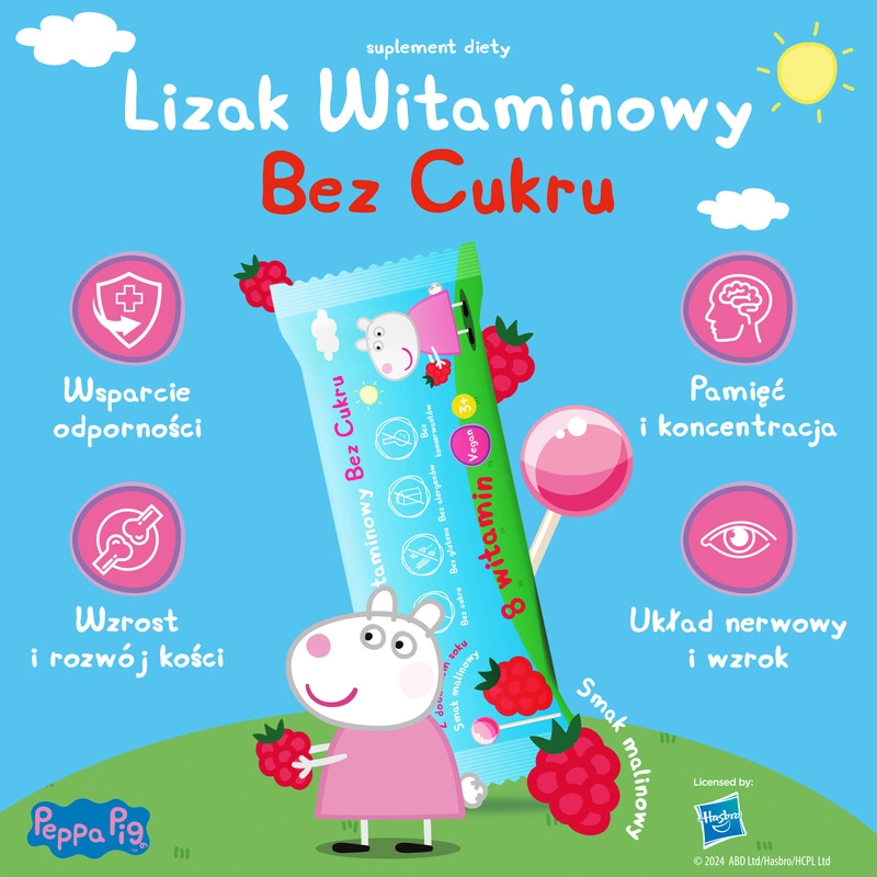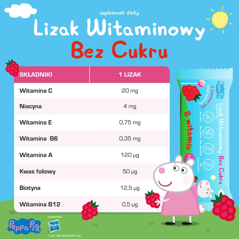 - Lizak Witaminowy Bez Cukru Peppa® Zawierają 8 kluczowych witamin (A, C, E, B6, B12, niacyna, kwas foliowy, biotyna) oraz naturalne soki owocowe.