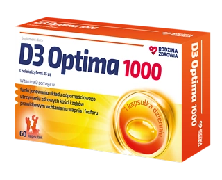 Suplement diety Rodzina Zdrowia D3 Optima 1000 w 1 kapsułce zawiera 1000 j.m. witaminy D, której suplementacja dla dzieci, młodzieży i dorosłych jest rekomendowana przez zespół polskich Ekspertów. Produkt polecany jest jako uzupełnienie codziennej diety w witaminę D w okresie od września do kwietnia w związku ze zmniejszonym nasłonecznieniem. Rekomenduje się go też osobom, które: chronią skórę przed działaniem promieni słonecznych, pracują w zamkniętych pomieszczeniach, mają niskie spożycie witaminy D w normalnej diecie.