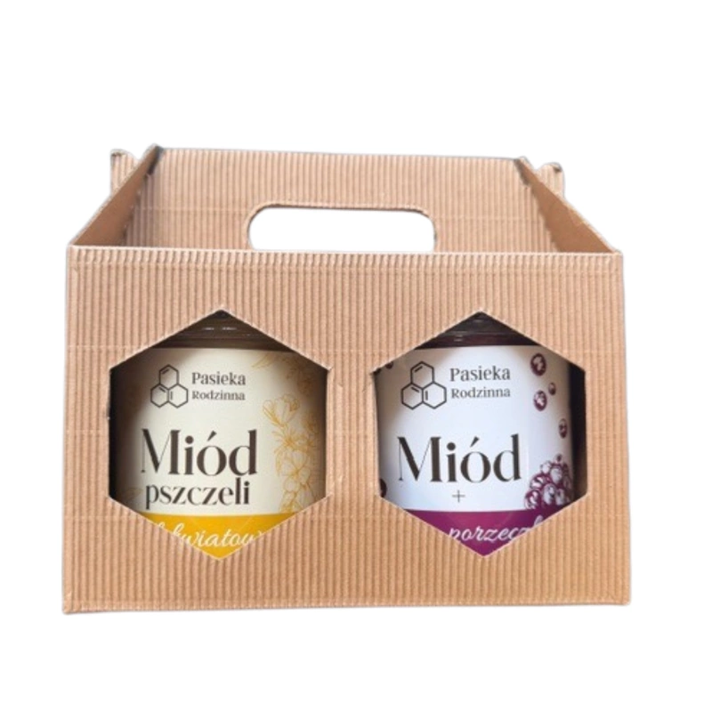 Pasieka Rodzinna zestaw prezentowy miód wielokwiatowy i czarna porzeczka z rączką 2 x 410 g