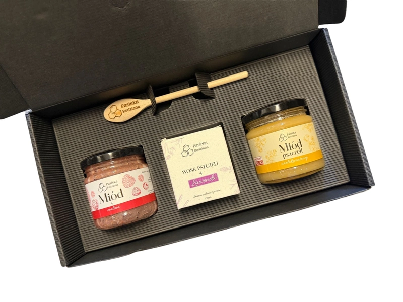 Pasieka Rodzinna ekskluzywny zestaw prezentowy miód malina i wielokwiatowy 240 g+ świeczka piernik + łyżeczka