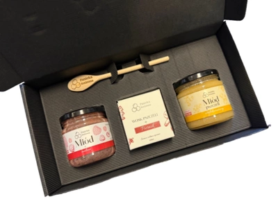 Pasieka Rodzinna ekskluzywny zestaw prezentowych miód malina i wielokwiatowy 240 g+ świeczka piernik + łyżeczka